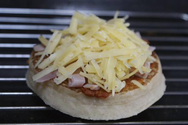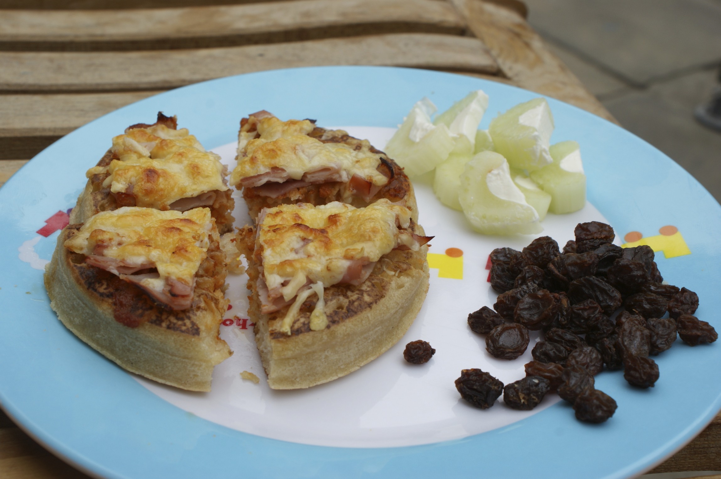 The concept is basically using a crumpet as a pizza base, spreading it with tomato or sun-dried tomato paste or even pesto, a scattering of chopped ham and then a liberal sprinkling of grated cheese.