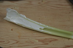 As salad items go it can be a bit stringy and chewy, so I slathered some cream cheese up the middle of a stick of celery then cut it into thin slices.