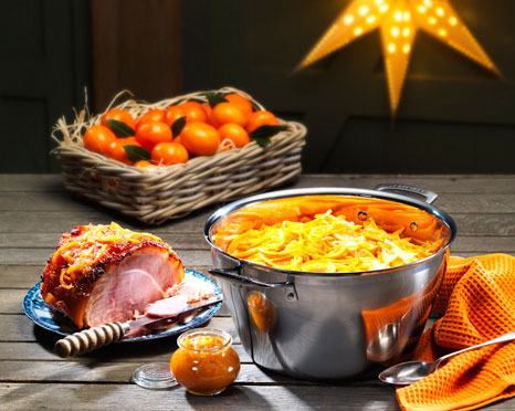 I normally follow Nigella’s recipe that sees you boiling the ham in coca cola and glazing it with treacle, sugar and mustard, but the folks at Le Crueset got in touch to see if I’d try out their version.