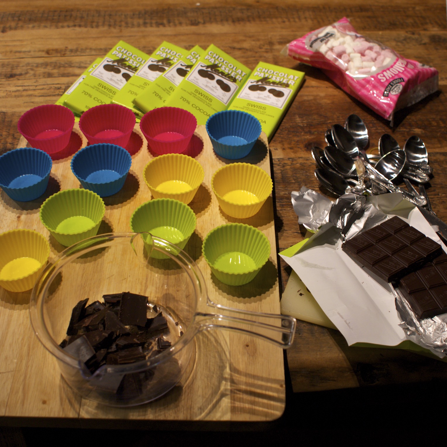 You need a stack of silicone fairy cake cases and lots and lots of chocolate. I opted for a decent cooking chocolate with a 70% cocoa content.