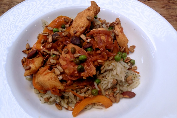 I let the chicken sit in the marinade for an hour in the fridge and then stir fried it gently in the sauce, so the meat was thoroughly cooked but remained soft. In the last couple of minutes I added the chopped peppers, frozen peas and grated carrot.