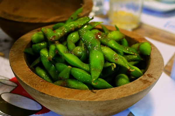 Edamame – a Japanese affair,  these steamed green pods arrived in a gorgeous wooden bowl drizzled with sweet chilli sauce.