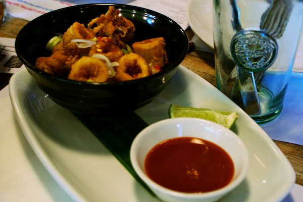 Muc Chien –  crispy calamari served with chopped chilli, spring onion and a wedge of lime. There was a lovely chilli-spiked dipping sauce on the side. We made short work of these – the boys really liked them.
