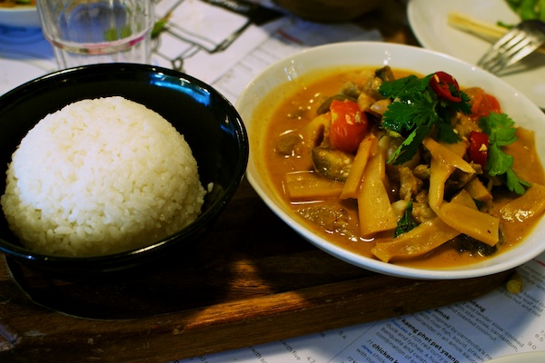 Kaeng phet pet yaang – a rich red duck curry with lychees hailing from Thailand – I had this with sticky rice and it was the right amount of spice to give some heat but blow your tastebuds to pieces, and not sickly sweet either. Generous portion size.
