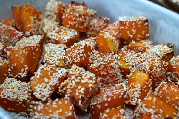 These are little cubes of butternut squash, marinated in sesame oil, soy sauce and honey, coated in sesame seeds and roasted. A really light and delicious bite that adds a vibrant streak of orange to the table.