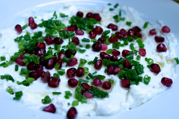 And this little number is a heavenly mix of ricotta and goats cheese, scattered with pomegranates and chives with a lovely honey and vinegar dressing. Fabulous as a dip or smothered on bread.
