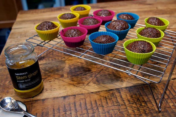 To get an extra amount of gingery ooze I used the great trick of spiking them all over with a fork once they were out of the oven, and then spooning over a little of the syrup from the stem ginger jar and letting it sink into the sponge as it cools.