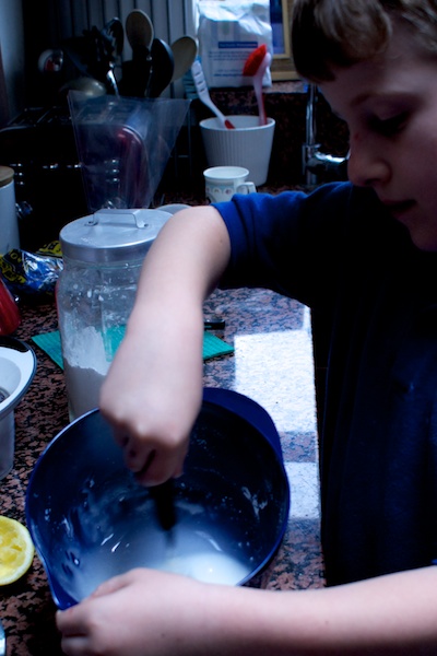 I then enlisted Sam to make the lemon icing. Perfect job for a young ‘un – squeezing lemons, sieving icing sugar and then mixing. “Awsome” according to Sam.