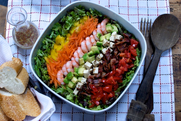 So i’ve taken some classic chopped salad ingredients like avacado and bacon, but also added my own favourites like juicy king prawns and cubes of Apetina cheese.