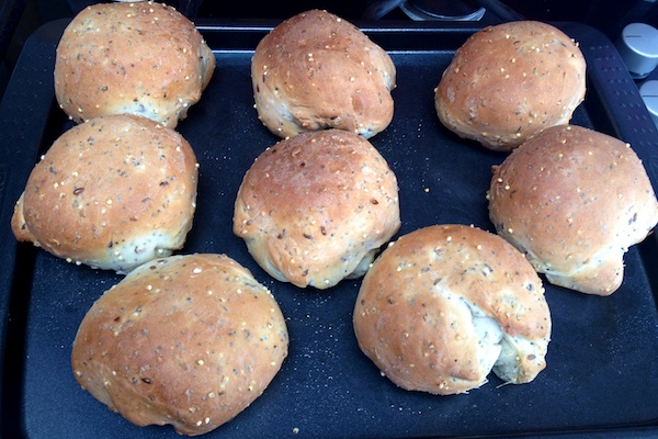 7. Preheat the oven to 220C/200C fan/gas 6. Take the cling film off and place the tray of bread rolls in, turn the temperature down to 200C/180C fan/gas 5 and cook for 15 minutes. Remove from oven, tap on the underside and if they sound hollow they’re done.
