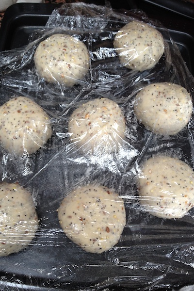 6. Place the rolls on an oiled baking sheet and cover with oiled cling film again, and leave to rise in a warm place for 45 minutes.