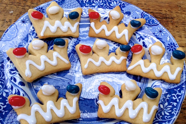 I rushed these cookies out last night with the other half of my iced gem cookie dough which I had in the freezer. I stamped out the shapes using Lakeland’s marvellous crown cookie cutters and decorated with simple royal icing dotted with patriotic coloured jelly belly sweeties.
