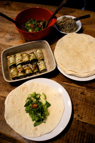 Aubergine rolls: Matthew is very suspicious of aubergines but LOVED this dish of rolled up thin slices of salted and fried aubergine with a smooth chickpea paste filling served up in a soft tortilla with salad. The boys didn’t feel the same way so I hastily whipped up some fishfingers to go in their salad wraps! There was quite a lot of preparation involved with this recipe for a weeknight meal.