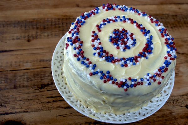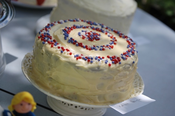 I instantly regretted choosing cream cheese frosting as the weather surprised us on Saturday and was sunny – luckily the cake didn’t slide off its plate as I slipped a couple of ice packs into the cake carrier and hid it under the table until it was time for the judging.