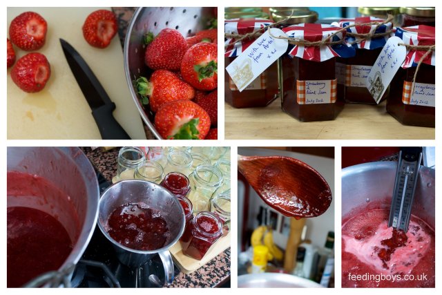 Faced with more fruit than we could feasibly eat in a short space of time, I decided the best thing to do was make jam. Coming to the end of term there are teachers’ gifts to come up with, not to mention a flurry of visits to relatives over the holidays, and what better gift to give than summery strawberry jam.
