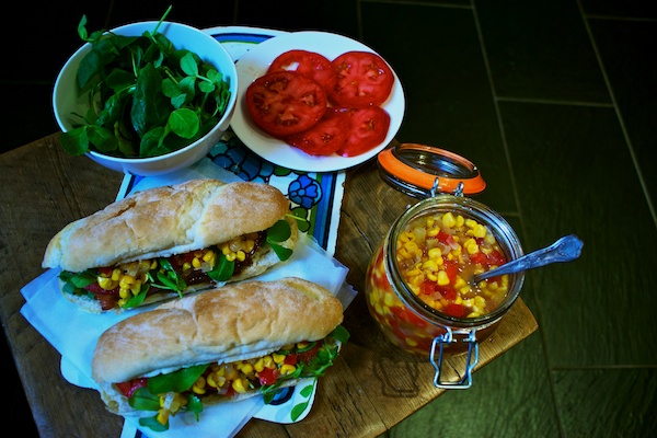 Turkey and bacon subs with chunky sweetcorn relish