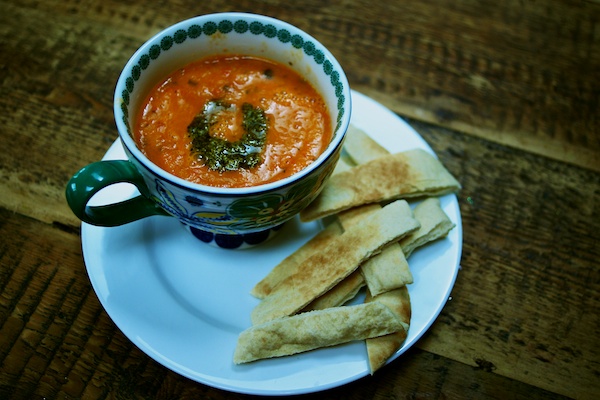 4. Serve in bowls with a swirl of pesto and some toasted pitta for dunking.