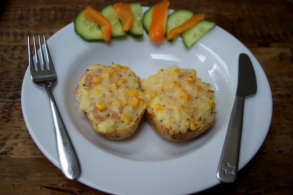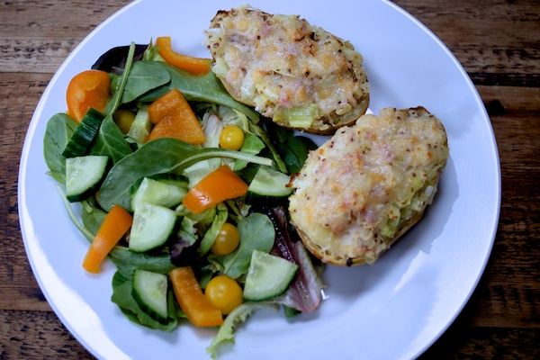 The beauty of making these is that you can put whatever you’ve got knocking about in your fridge in them.  A great way to use up leftovers and you can customise each potato according to that person’s tastes.