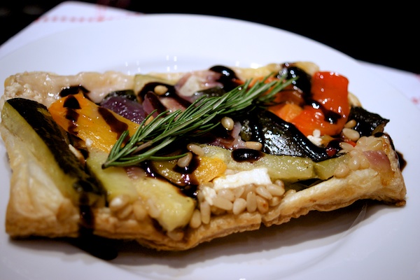 So for the grown ups: roasted peppers, courgette, red onion, pine nuts and feta cheese with rosemary drizzled with balsamic glaze.