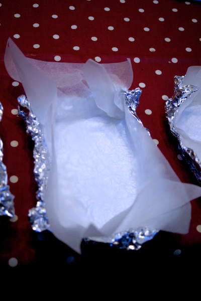 Well not too complicated – just a bit of folding and scrunching of foil and greaseproof paper. The vegetables are roasted first in a dish in the oven, then you simply make individual nests of said foil lined with greaseproof, scatter with sugar, plop in your roasted veg, cheese and pine nuts and then a rectangle of puff pastry. Effectively you’re cooking them upside down.