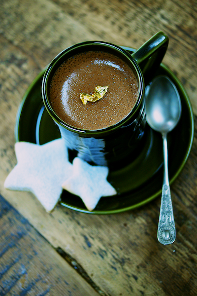 8. Take the chocolate cinnamon pots out of the fridge 30 minutes before you want to serve them so they can come to room temperature and decorate with a little gold leaf. Dust the cookies with a little icing sugar then place a couple on each saucer and serve.