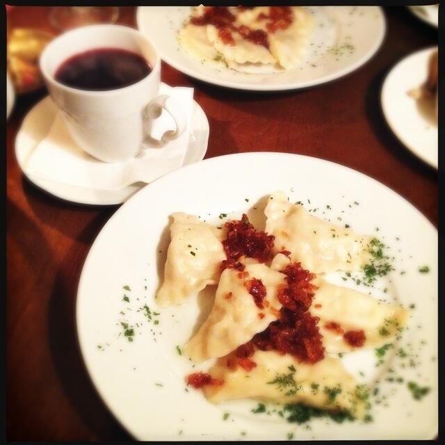 And as you can see pictured here, we indulged in a couple of plates of pierogi – traditional Polish dumplings which you can have with a variety of fillings. They were like delicate ravioli. We opted for cheese and potato along with bacon and buckwheat all topped with caramelised onions. Sooooo good, but left us far too full to finish our main courses or even attempt dessert. Next time!